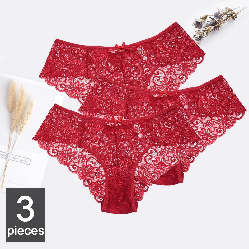 Fallsweet 3 ชิ้นแพ็ค เซ็กซี่ผู้หญิงกางเกงในลูกไม้กางเกงในลายลูกไม้ S M L XL ชุดชั้นในสตรี สีแดง - INTL
